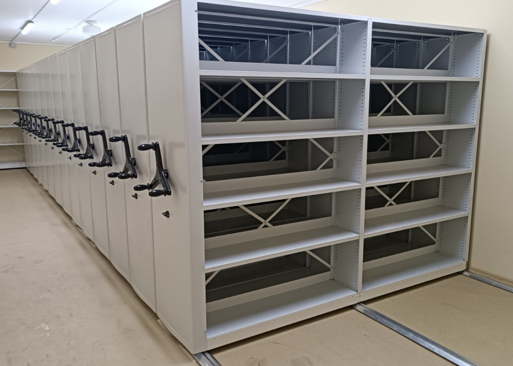 Мобильные стеллажи позволят увеличатить в 2 раза вместимость хранилища документов. Возможно хранение в коробах, пачках, папках.